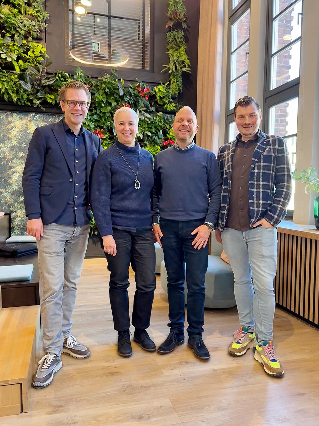 Freude auf beiden Seiten: v. l. Johannes Kleikamp (Geschäftsführender Gesellschafter, Viehoff Gruppe), Friederike und Carsten Avermann sowie Christian Wiesner (Geschäftsführer, Viehoff Gruppe) beim Treffen in Münster.